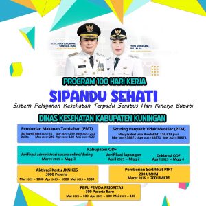 Dinas Kesehatan Kabupaten Kuningan berkomitmen untuk berperan aktif dalam mendukung Program 100 Hari Kerja Bupati dengan berbagai program/kegiatan unggulan di bidang kesehatan. Dinas Kesehatan Kuningan melauncing program/kegiatan unggulan di bidang kesehatan dengan tema SIPANDU SEHATI (Sistem Pelayanan Kesehatan Terpadu Seratus Hari Kinerja Bupati).